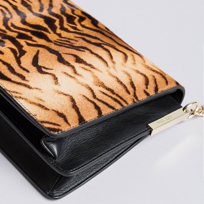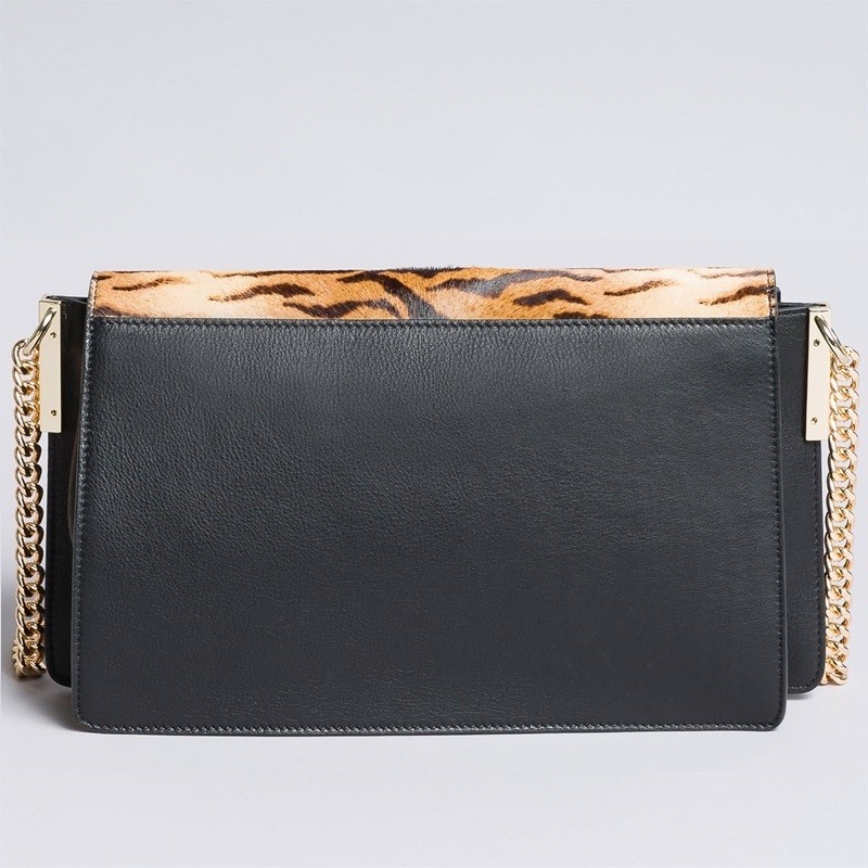 Tracolla con patta in cavallino animalier e pelle di vitello, chiusa con magnete, tracolla in catena con spallaccio.